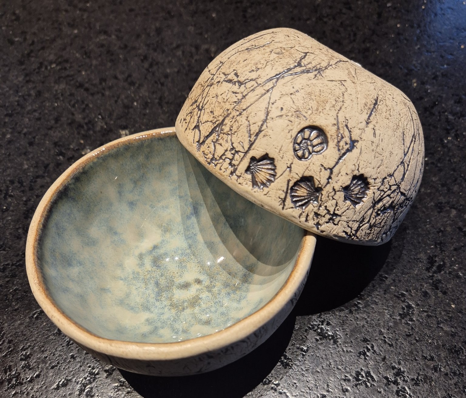 hier kannst du deine persönliche Müeslischale töpfern und mit Holzstempeln verzieren und aus 3 verschiedenen Glasurfarben darfst du dann auswählen, welche du gerne möchtest (Geschirrspülmaschinen fest)