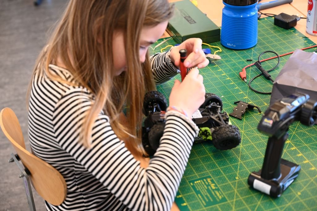 Gemeinsam schauen wir uns kaputte Sachen an, schrauben, testen und probieren aus. Manchmal klappt die Reparatur – und manchmal nicht. Aber keine Sorge: Aus kaputten Dingen entstehen bei uns fantasievolle Kunstwerke!