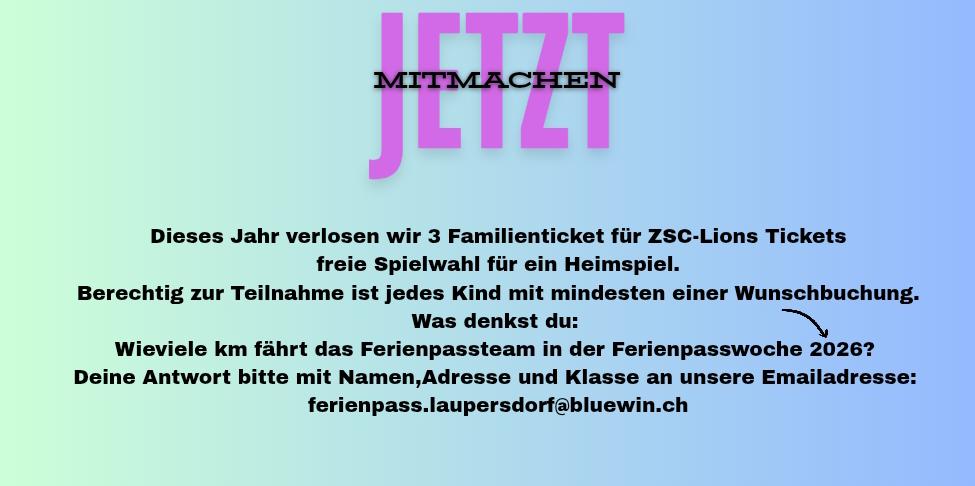 Startseite Aktuelles …wettbewerb… …wettbewerb… 02. April 2026 Kontakt Per Mailferienpass.laupersdorf@bluewin.ch Weitere News ...ferienpass sommer 2026... 11. März 2026 ...erlebnisreich wahrs... 09. August 2025 ...ein hauch neuer wind... 25. Juni 2025 Inhalt